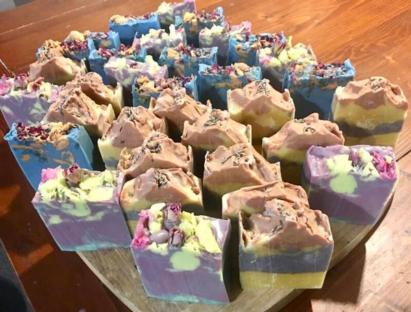 Made with Olive oil, Coconut and Shea butters and lye.